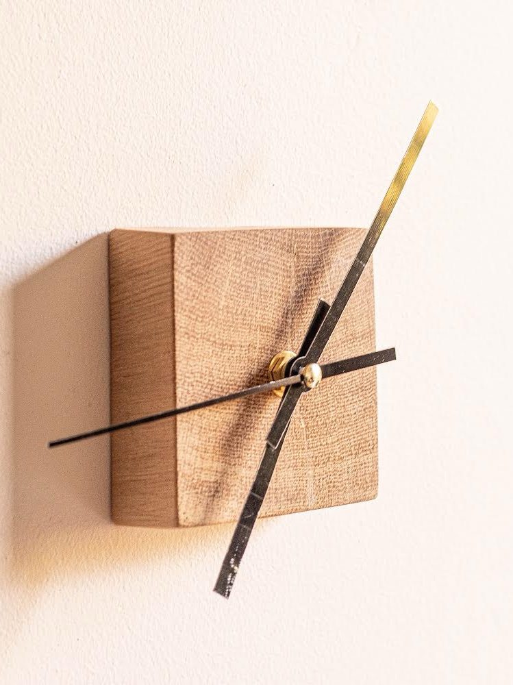 Horloge sobre en chêne, avec un mécanisme intégré dans le bois, la rendant entièrement fonctionnelle.